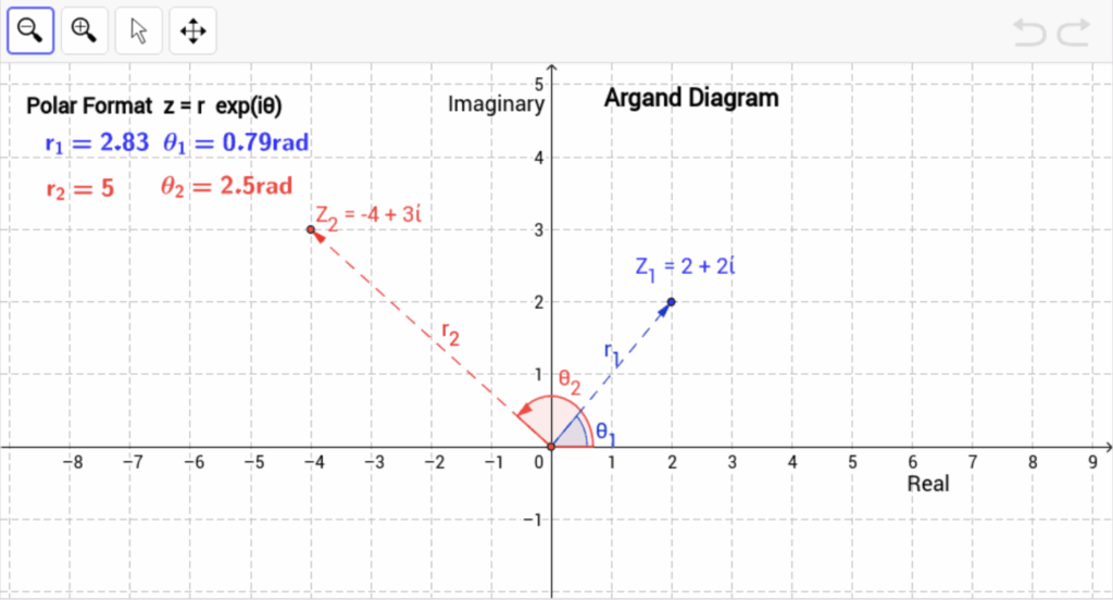 | Argument | Angle θ from positive real axis: θ = tan-1(b / a) (adjust for quadrant). | Arg(3 + 4i) ≈ 53.13° |