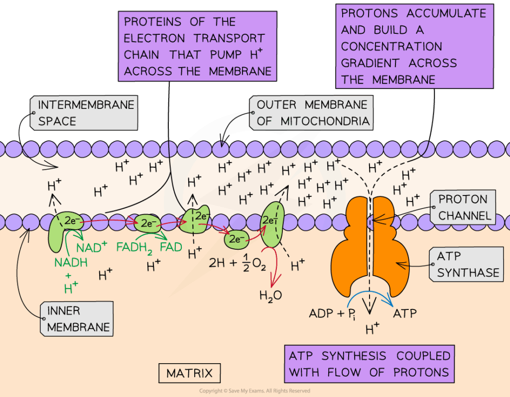 - Proton gradient drives ATP synthase to produce ATP via chemiosmosis.