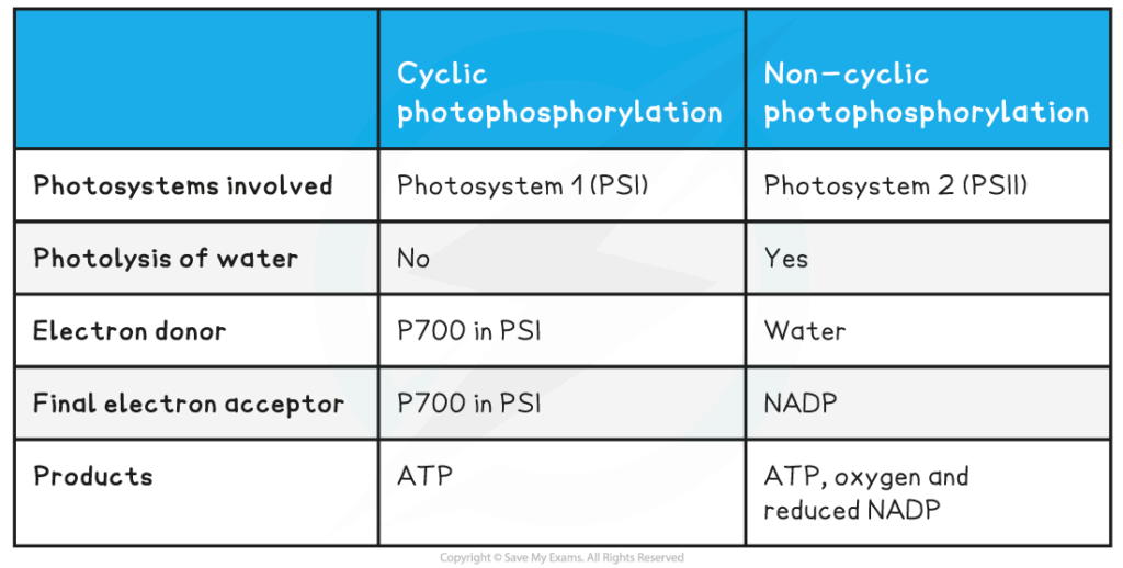 | Cyclic photophosphorylation | Electron flow involving only PSI, generating ATP but not NADPH or oxygen. |