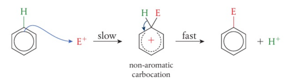 - After this, the hydrogen leaves the compound and the electrophile is substituted in its place